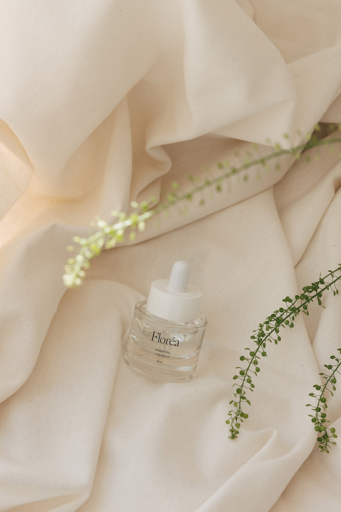 A refined mockup featuring a glass dropper bottle resting on smooth silk fabric, accompanied by subtle floral accents. The soft textures and delicate arrangement create a serene, elevated look—perfect for showcasing serums, facial oils, or luxury skincare treatments with a nature-inspired sophistication.
